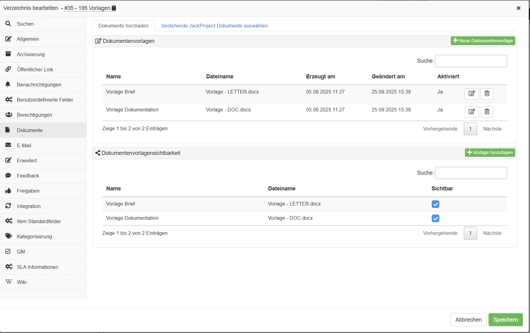 - Dort können Sie klassische Dokumentenvorlagen hochladen, bestehende Vorlagen verwalten und die Sichtbarkeit steuern.