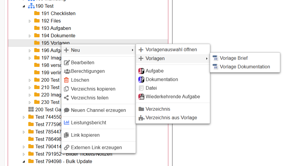 - Beispiel „Vorlage Dokumentation“: Erstellt ein neues Objekt auf Basis der Dokumentationsvorlage.